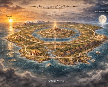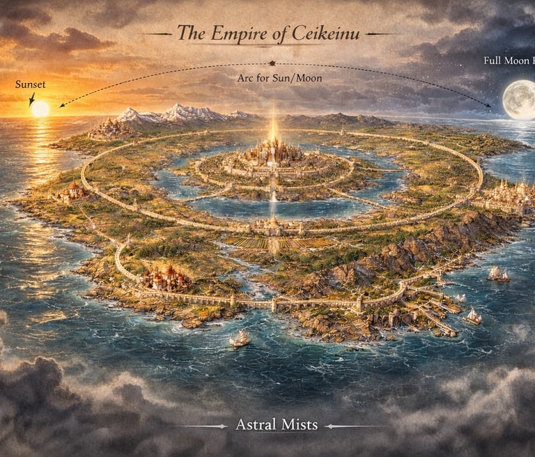 Detailed lore and geography defining Ceikeinu’s ordered realms.